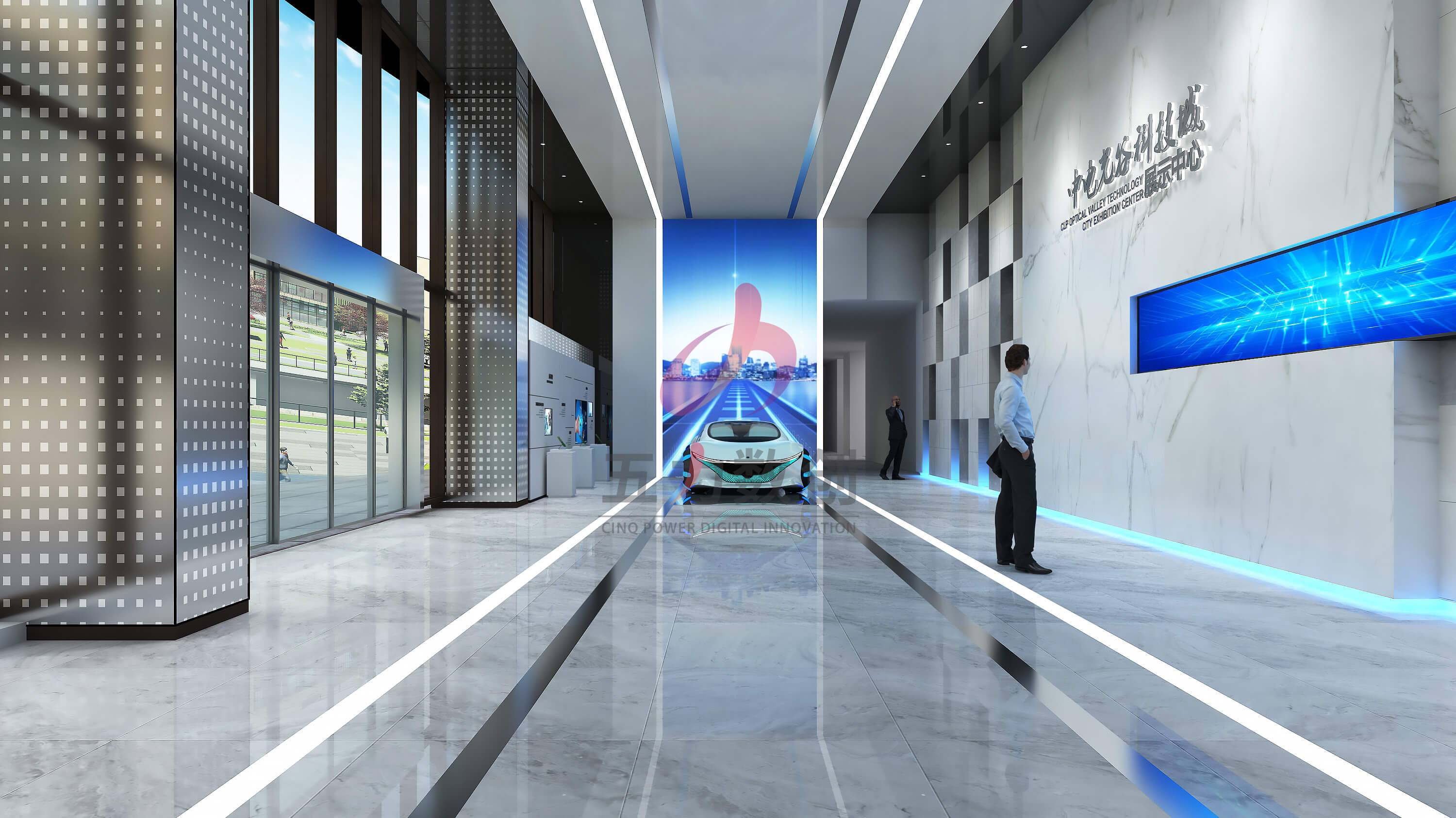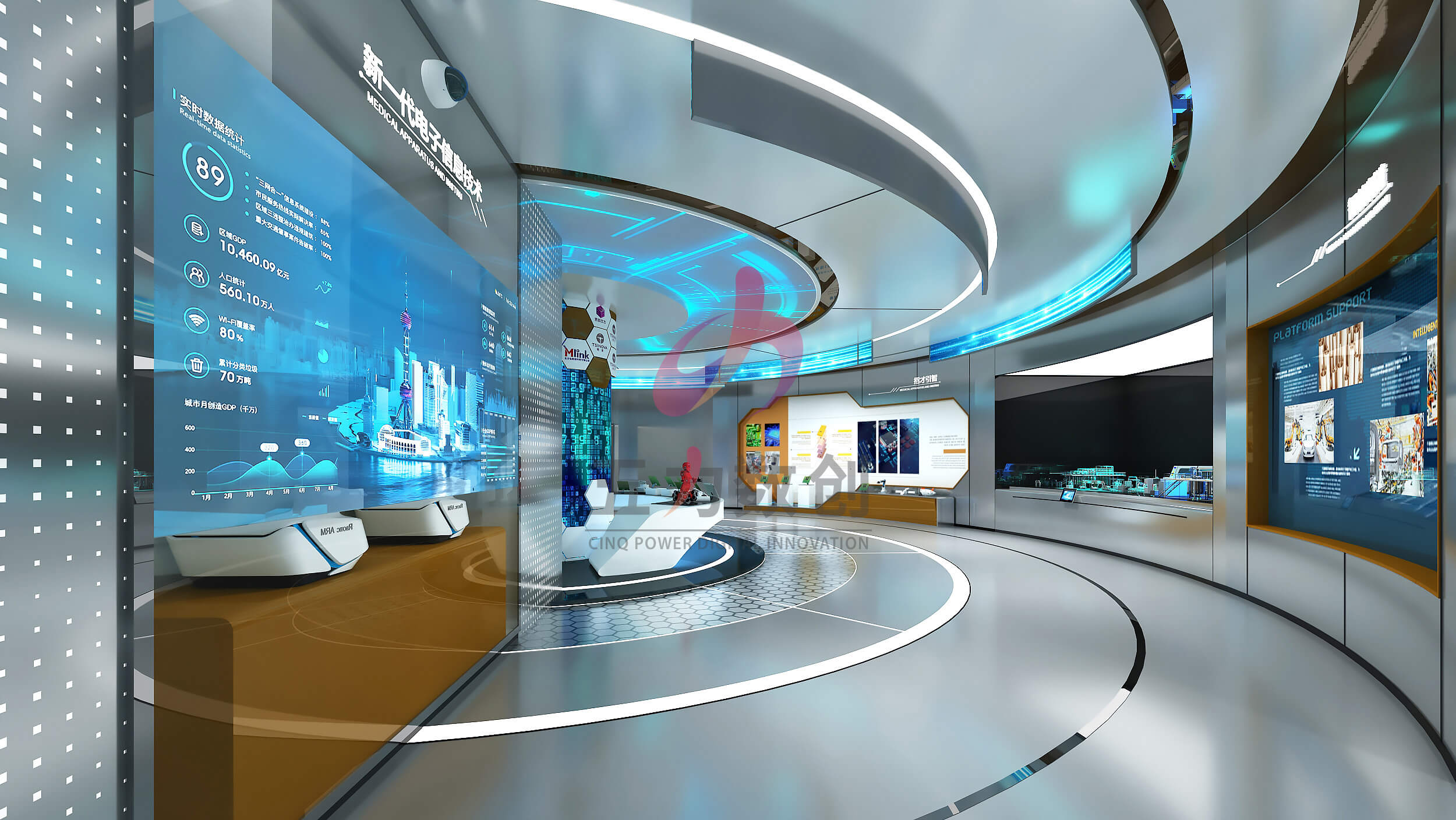 中電光谷科技城展示中心占地面積約為895㎡,共劃分為序廳,戰(zhàn)略篇、平臺篇、產(chǎn)業(yè)篇、未來篇五大展區(qū)。展廳設(shè)計以藍(lán)色和灰色為主色調(diào),營造濃厚的工業(yè)風(fēng)格;提取重慶山城設(shè)計元素和科技線條營造充滿現(xiàn)代感,科技感,未來感又獨具本地特色的展示空間。同時以數(shù)字沙盤、多媒體互動裝置、弧幕影院等多種數(shù)字多媒體展項布局,呈現(xiàn)沉浸場景,智能體驗,全方位展現(xiàn)園區(qū)項目和服務(wù),整體規(guī)劃和產(chǎn)業(yè)集聚以及優(yōu)勢成果,生動彰顯中電光谷在行業(yè)里的智造地位和強大實力,體現(xiàn)中電光谷的園區(qū)價值和孵化能力,助力招商引資。